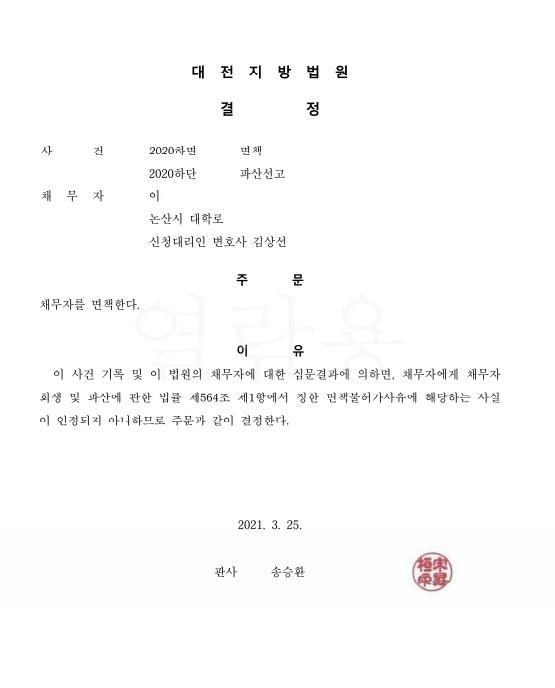 [파산 면책결정] 신청인 이** 대전지방법원
