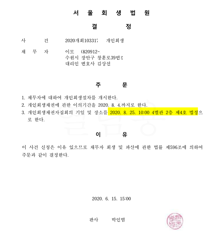 4월 8일 신청하여 6월 15일 개시결정이 결정되었습니다.